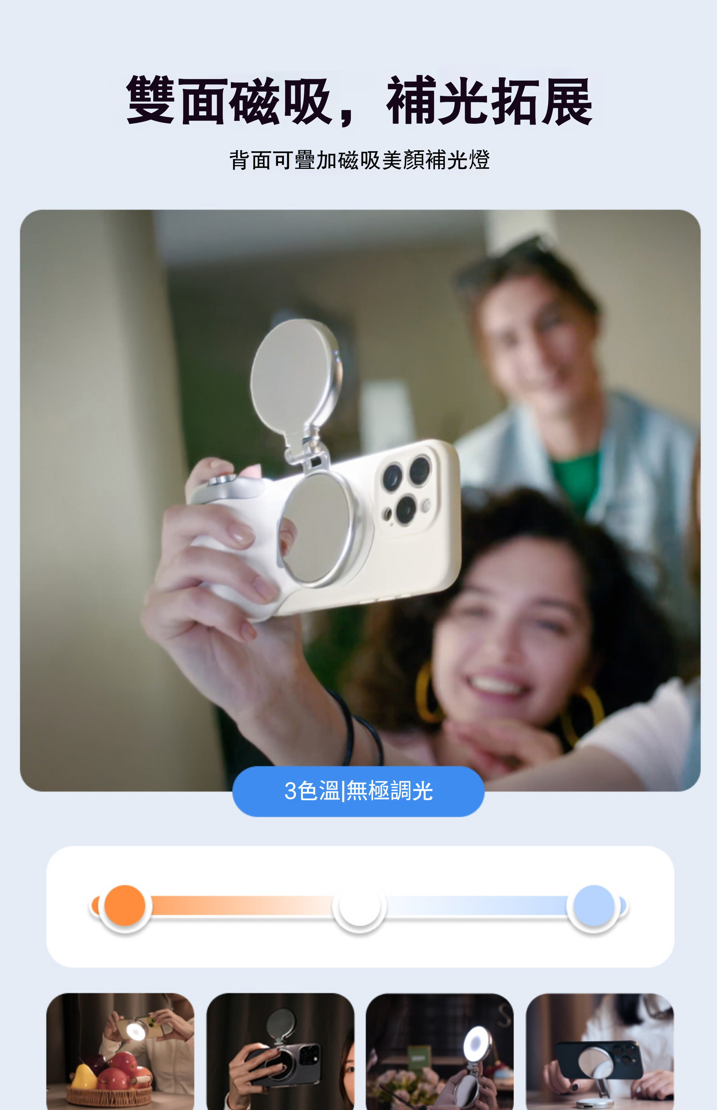 🔹補光不求人,拍出高質感大片感!💡🔹自帶光圈感,讓每一次自拍都閃耀動人!🌟🔹一手掌控補光+拍照,專業感輕鬆拿捏!📱🔹直播、錄影、拍照一機搞定,光感升級不糊臉!🎬